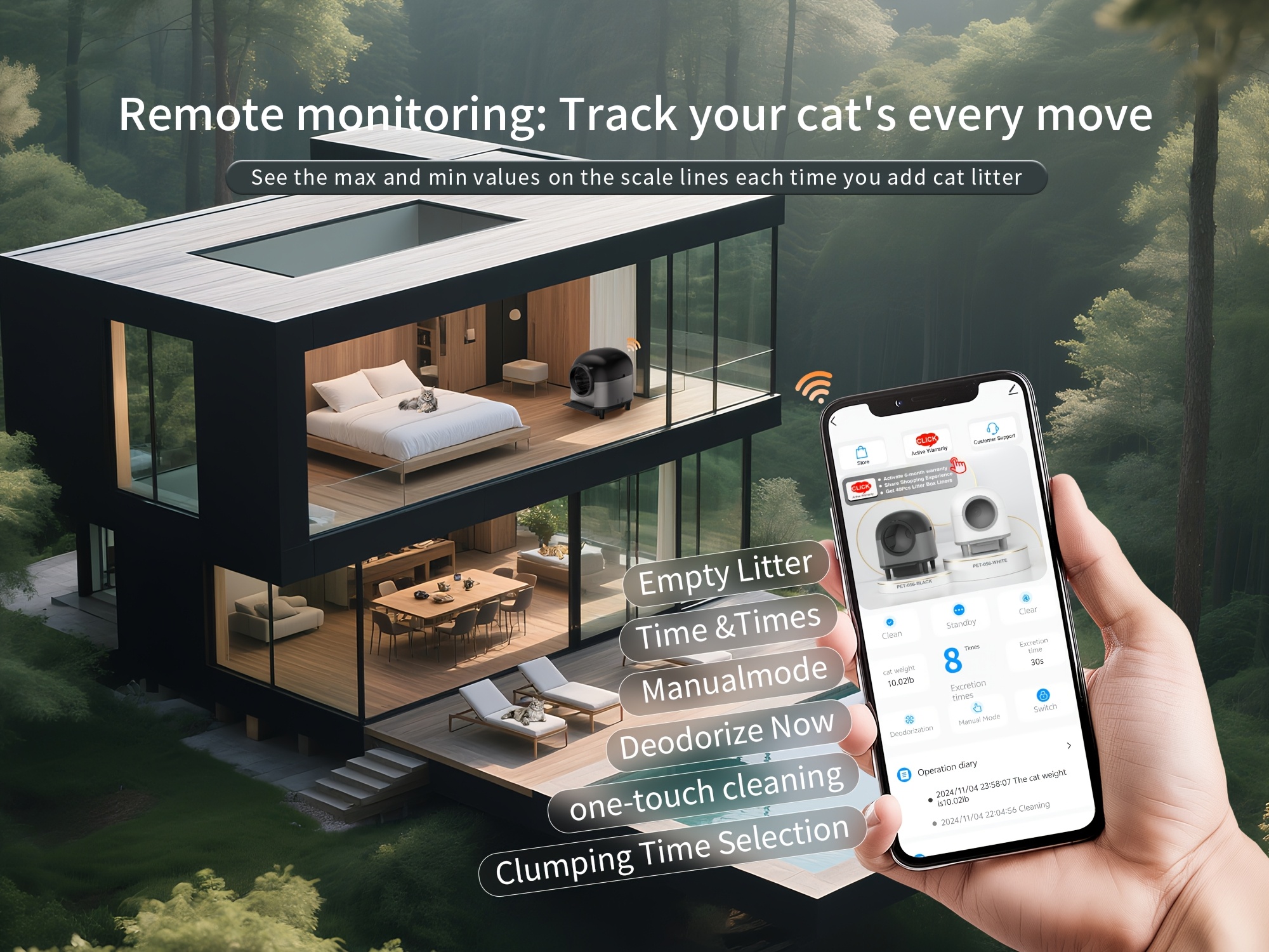 The soft ambient LED lighting serves a dual purpose: it helps your cats easily locate their litter box in the dark, reducing accidents, and adds a sophisticated, modern aesthetic to your home. Customize the lighting color and brightness through the app to match your home's ambiance or turn it off completely—it's your choice.